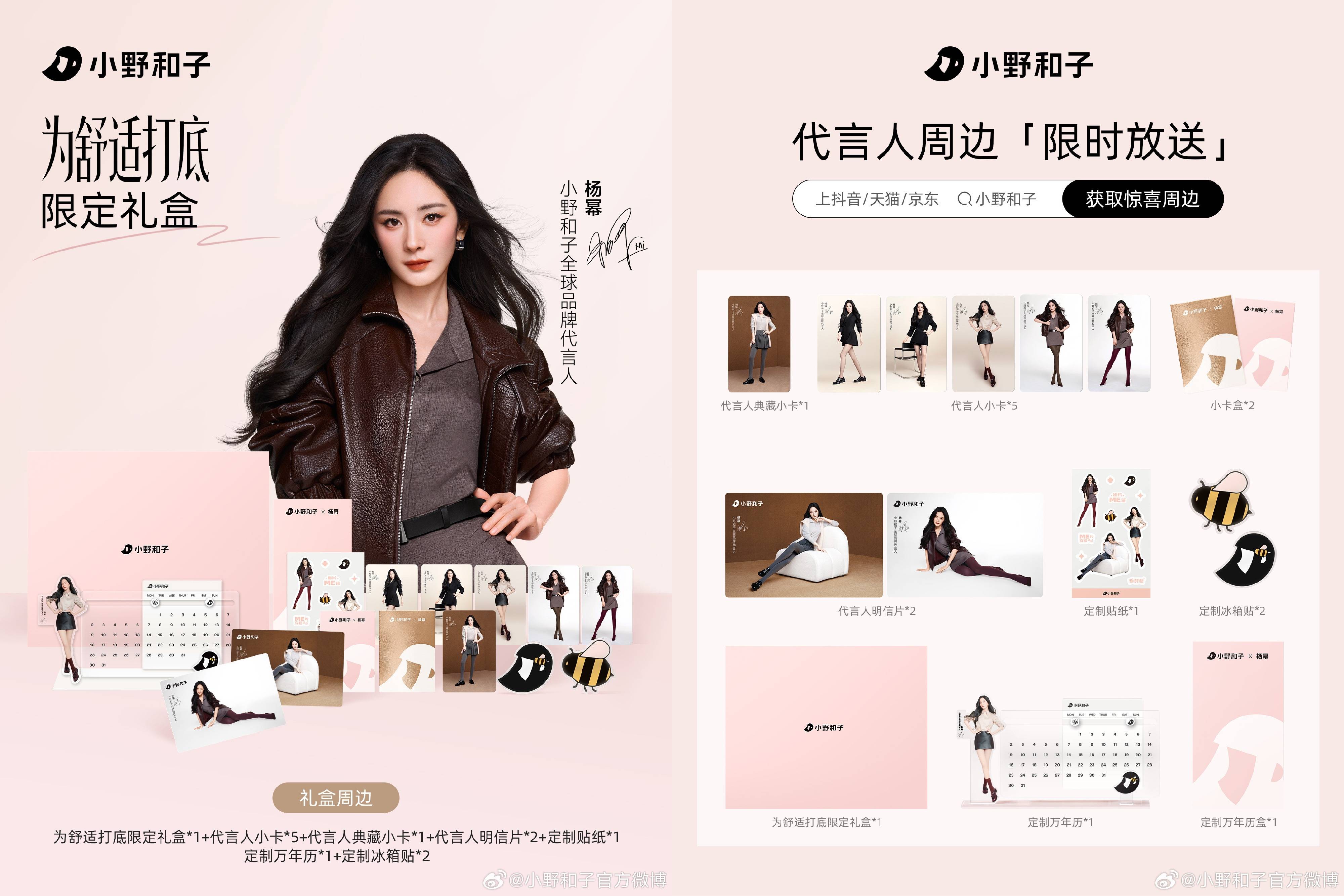 9 月 23 日,小野和子官宣杨幂(明星代言公司)为全球品牌代言人。双方将继续以中国文化为根基,将功能与美感设计结合,让衣服成为身体与意志的宣言,此次联动,双方将共同推出限定礼盒,包括代言人小卡、明信片、贴纸、万年历、冰箱贴等多款周边。不仅如此,品牌还将举办线下打卡活动,用镜头捕捉与杨幂及小野和子的同框时刻即有机会获得代言亲签,一起为舒适打底,解锁百搭灵感。