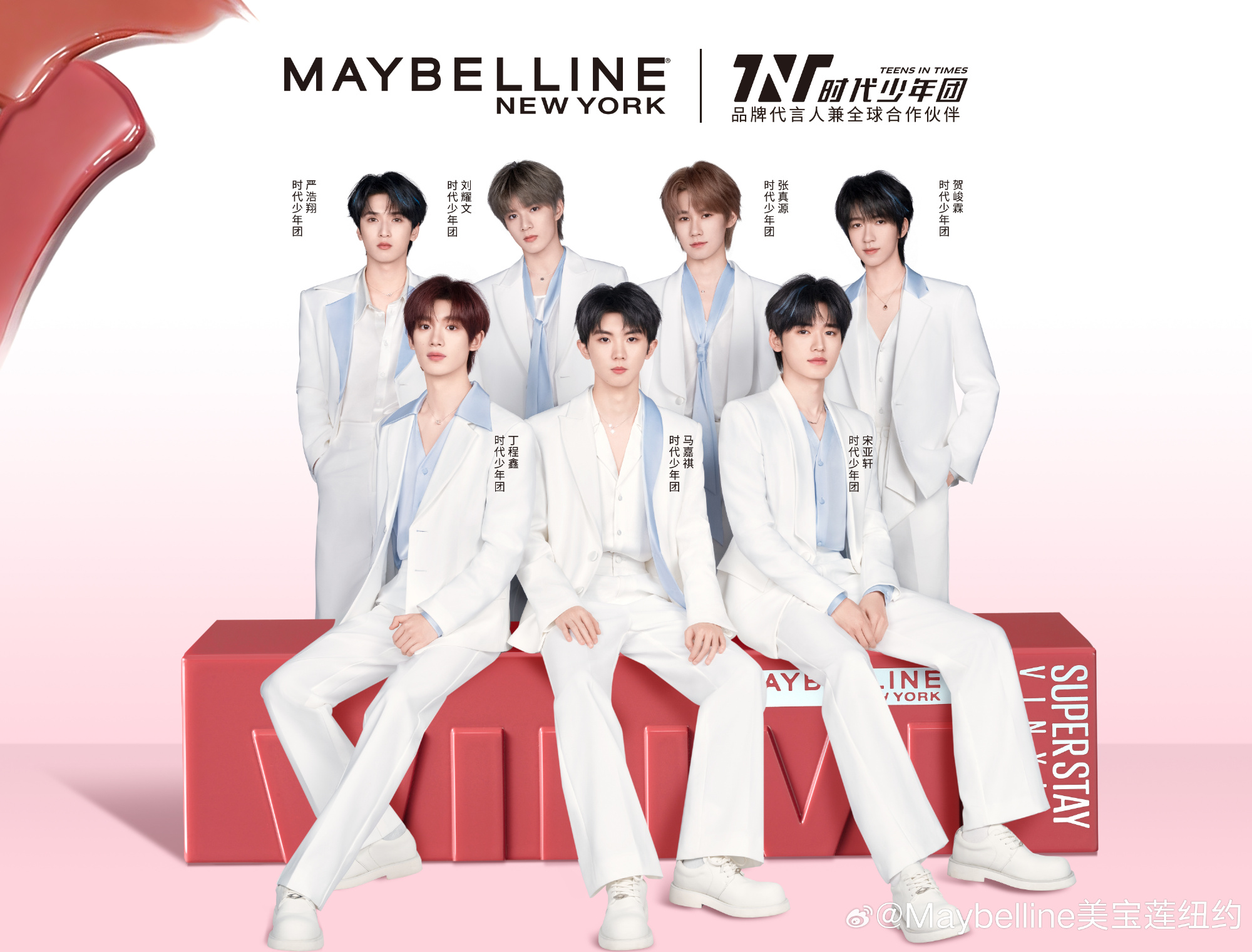 美宝莲纽约宣布时代少年团(明星代言公司)成为品牌代言人兼全球合作伙伴。在持续成长的轨迹中,时代少年团展现出多元的风格与团体魅力,与美宝莲纽约强调的自信表达和「美,不设限」的包容态度形成呼应。