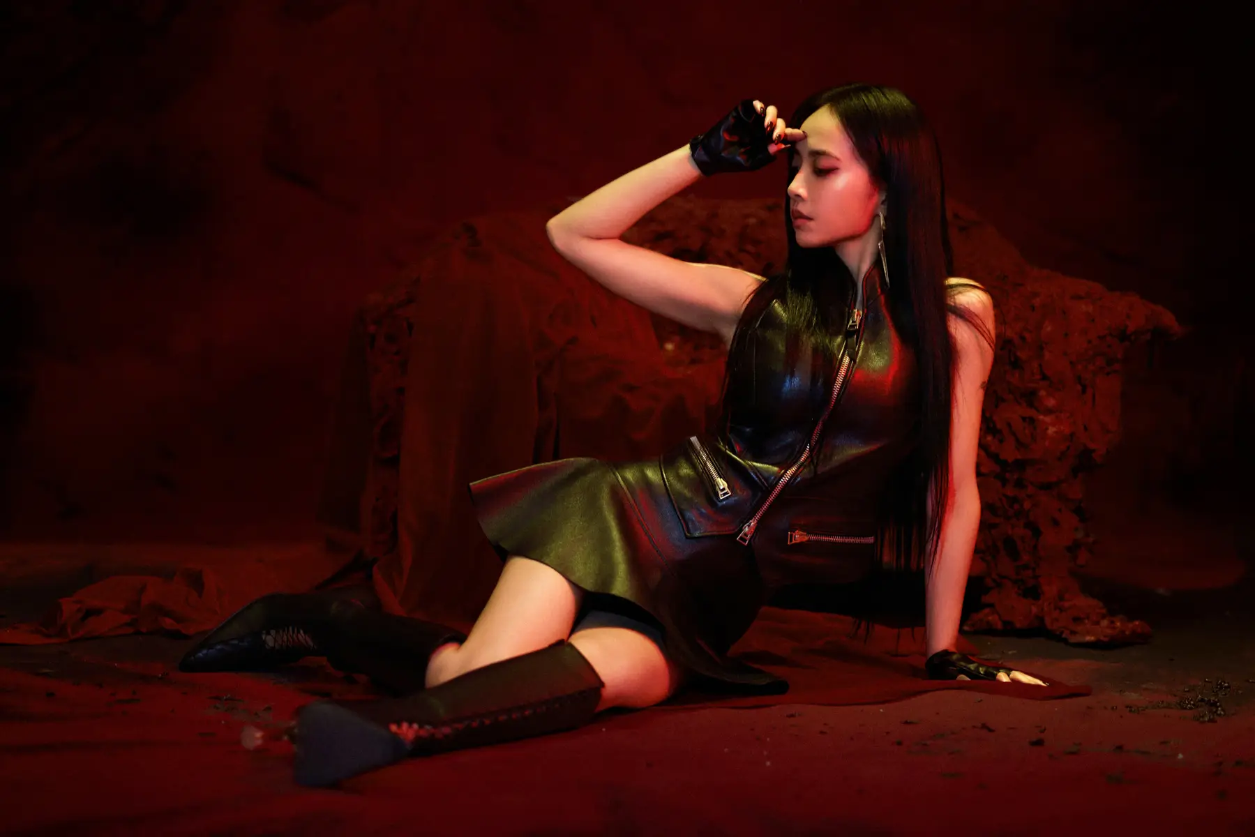 蔡依林穿黑色皮裙勾勒性感身材曲线。