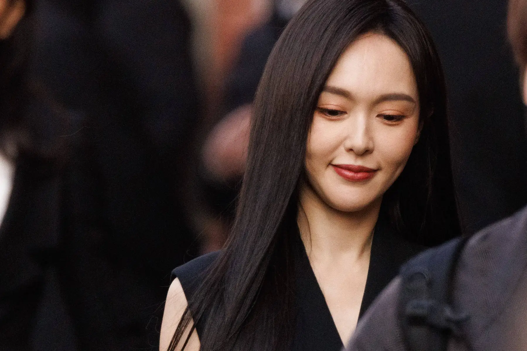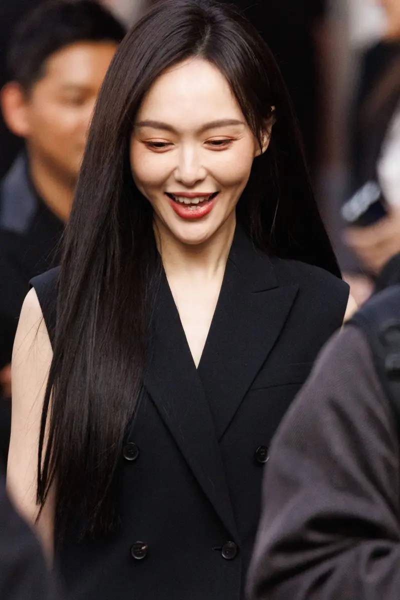 现身米兰时装周看秀现场。穿一袭黑色长裙,与现场的粉丝们互动。