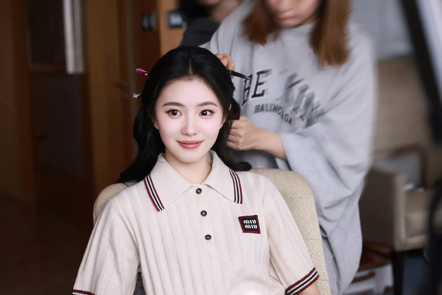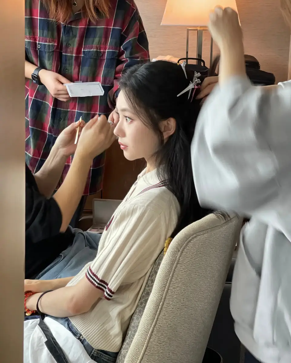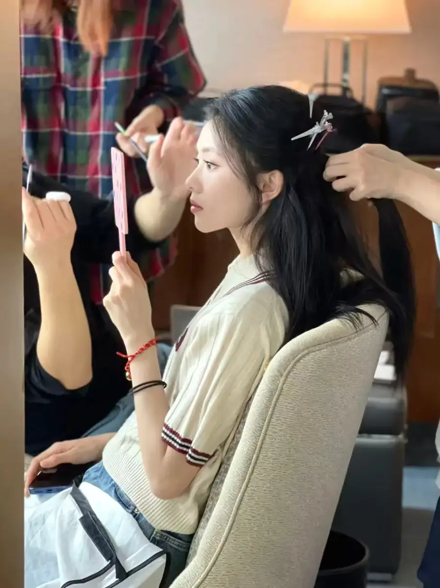 近日,刘浩存(明星经纪公司)一组化妆间花絮曝光。她身穿学院风针织衫,做妆发时神态灵动,尽显少女清新感。