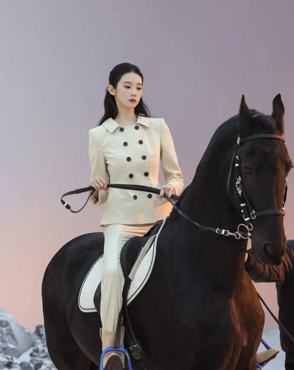 张艺凡雪地骑马飒爽英气 米白西装尽显利落气场