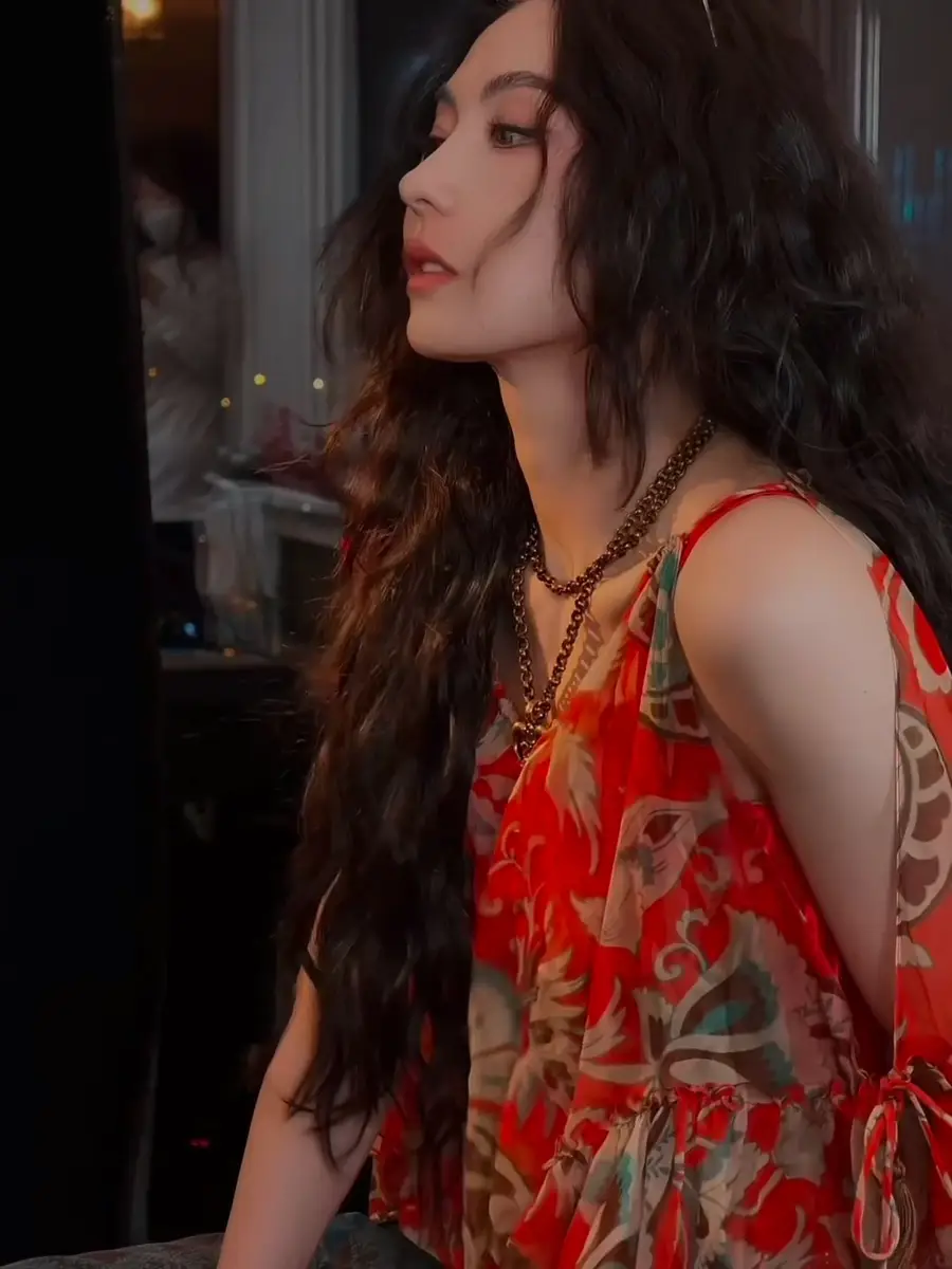 张柏芝身着红底印花吊带裙,复古热烈。