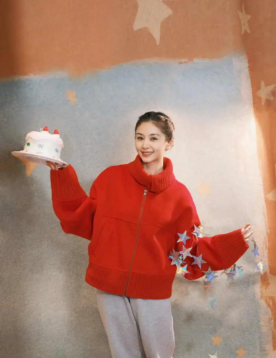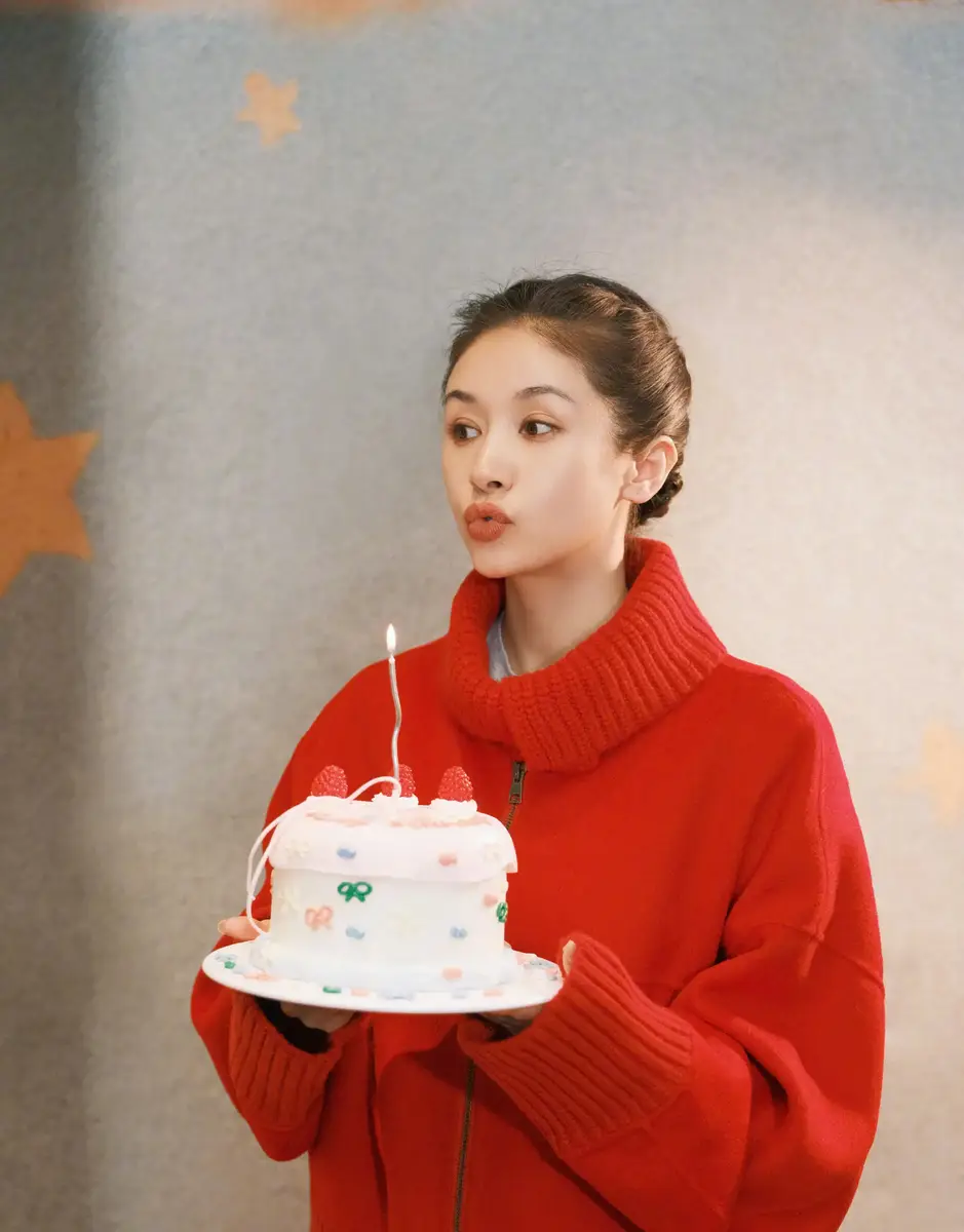 王子文穿红高领毛衣明媚鲜活 捧蛋糕戴星星装饰元气甜美
