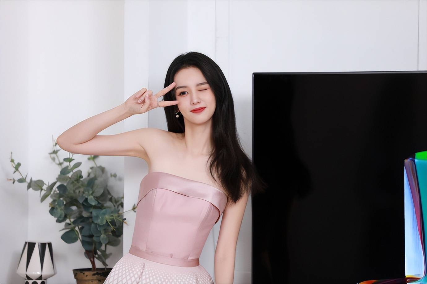 周也穿粉色抹胸裙大秀香肩!雪肤玉貌青春玉女美爆了