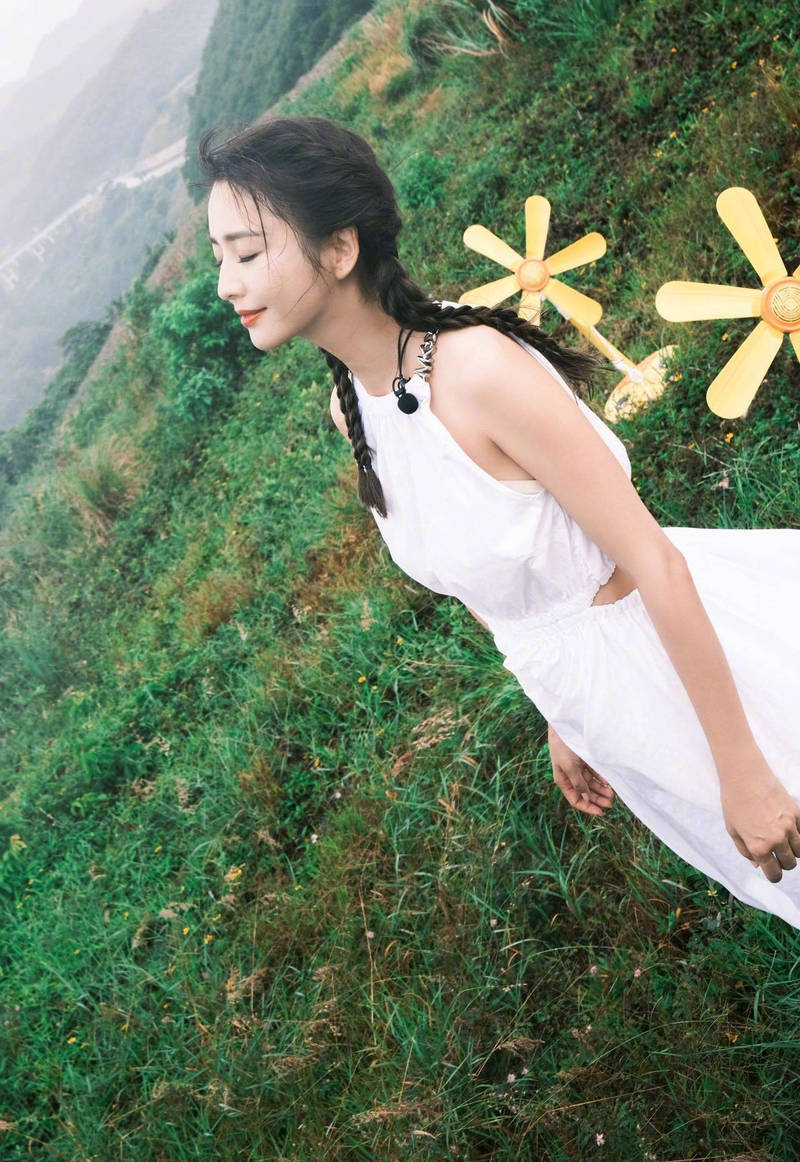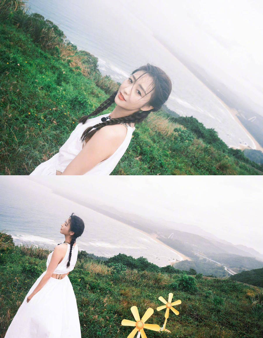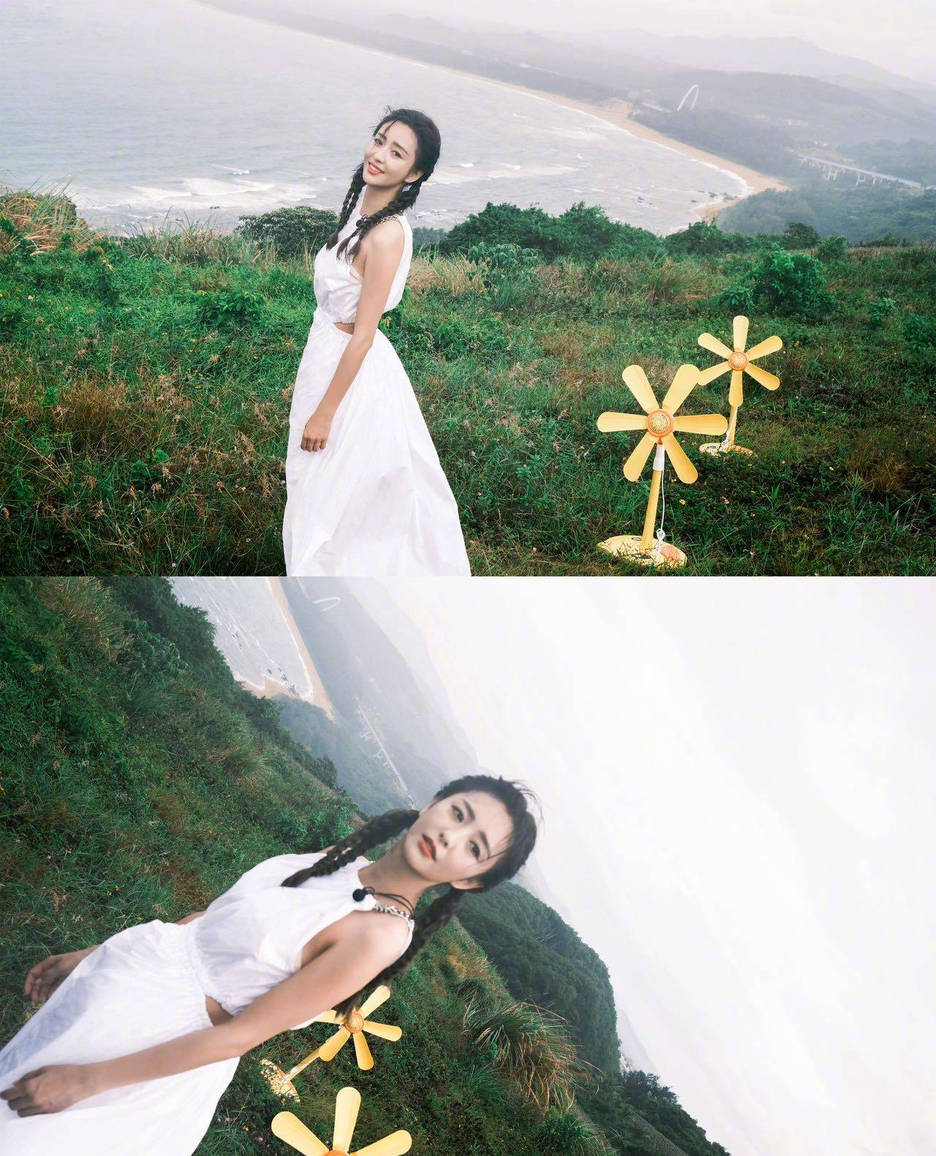 佟丽娅站在山野中拍美照,清新感满满。