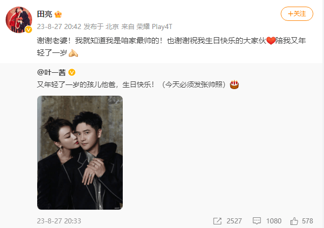 星全文化明星经纪公司资讯:8月27日,叶一茜(明星经纪公司)发文为老公田亮庆生:“又年轻了一岁的孩儿他爸,生日快乐!叶一茜还晒出二人合照恩爱甜蜜。