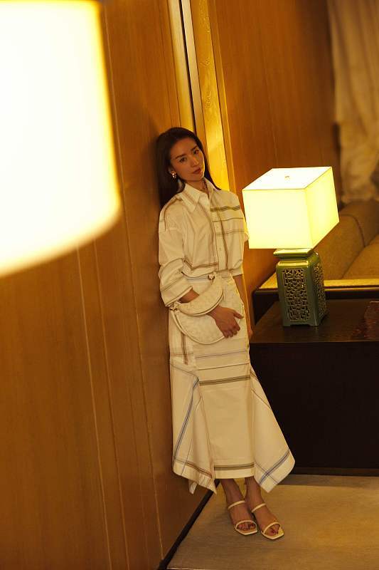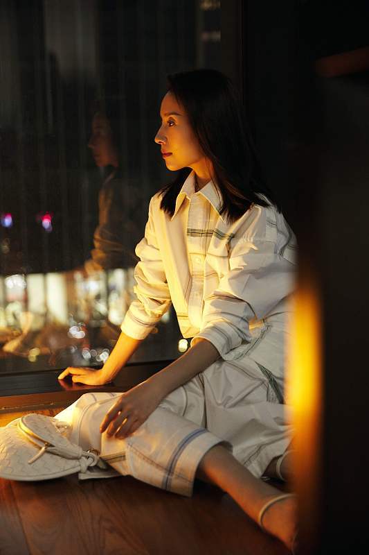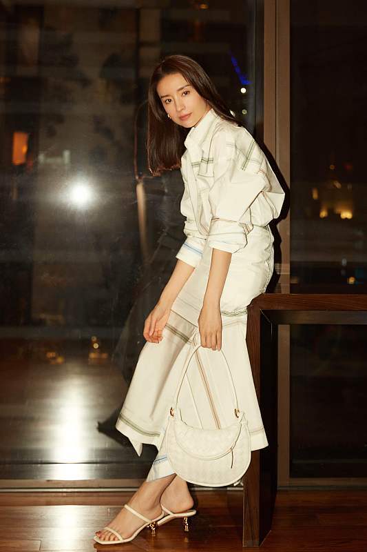 董洁穿白色条纹套装清冷气质 身形纤细眼神坚定