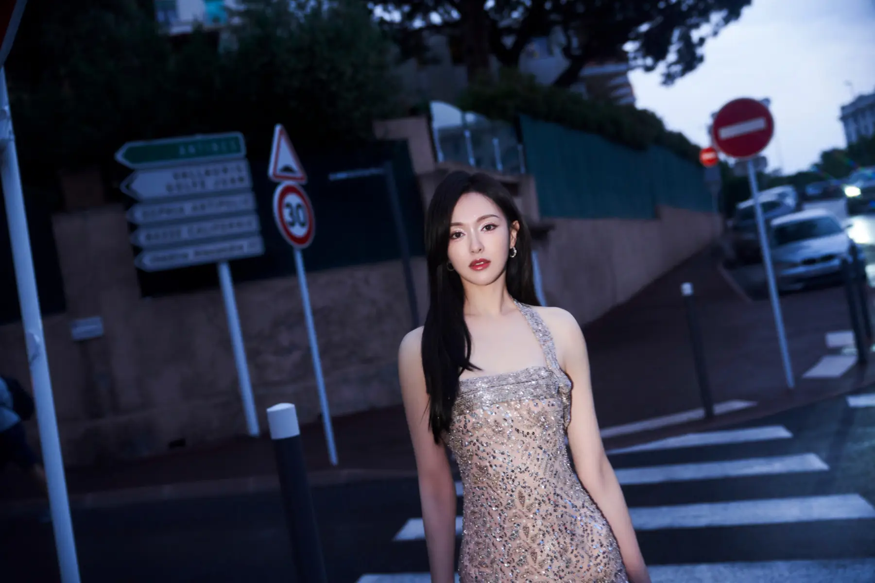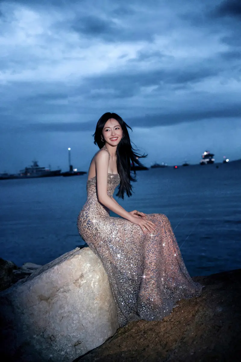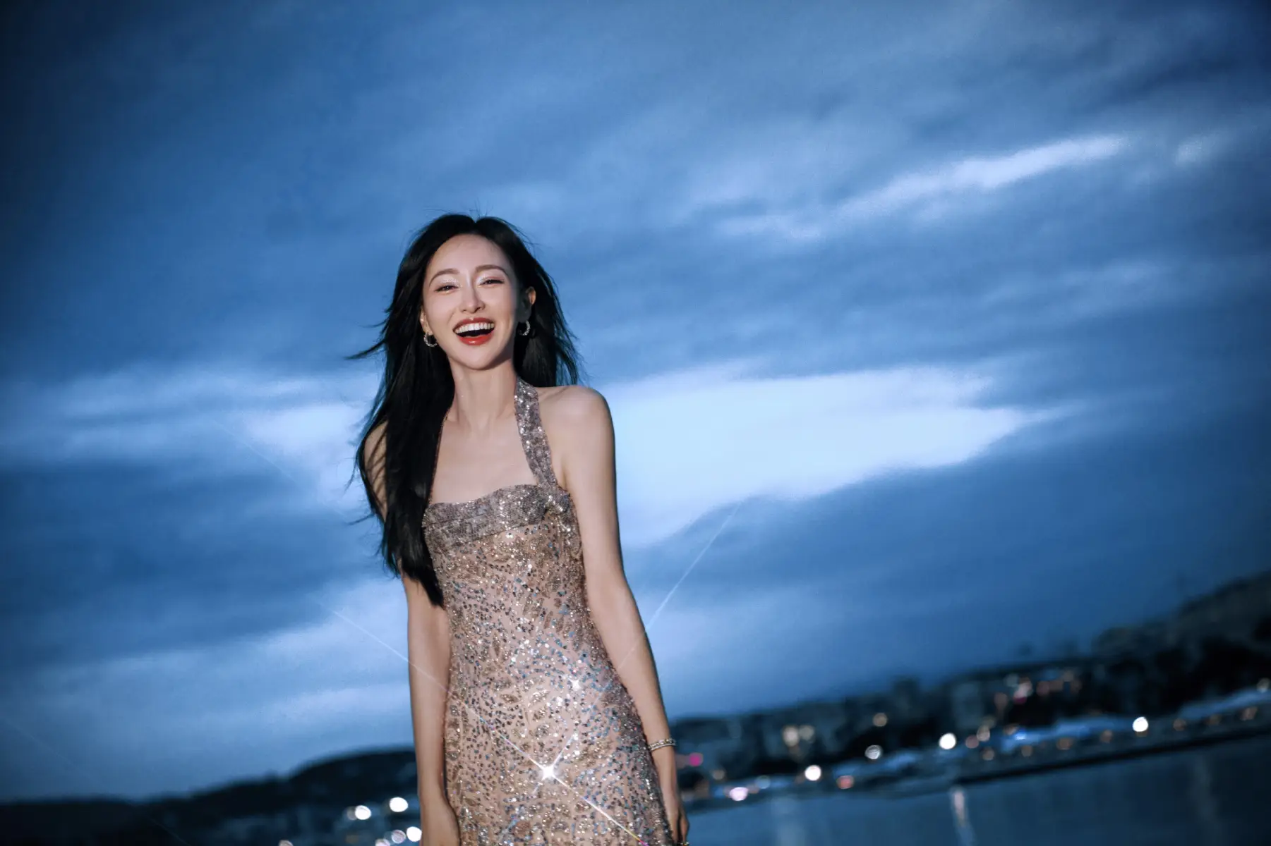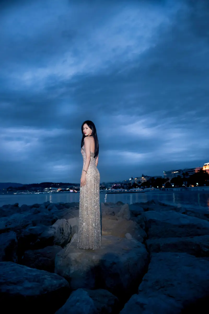 唐嫣穿亮片刺绣裙明艳照人 戛纳海边伫立满眼星河