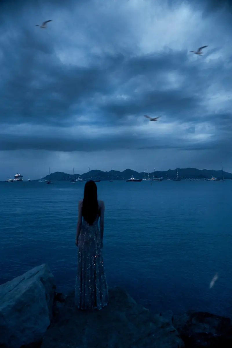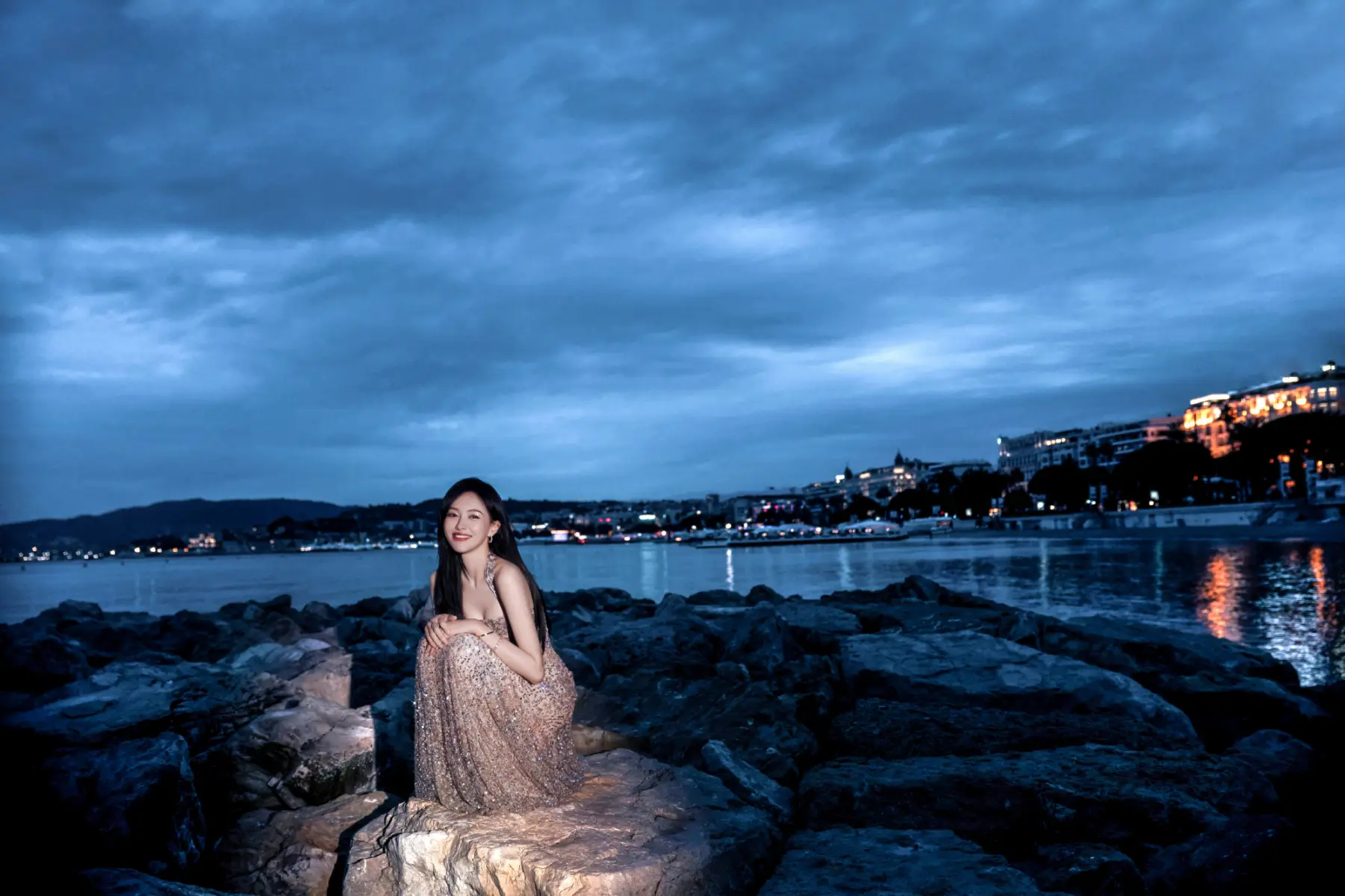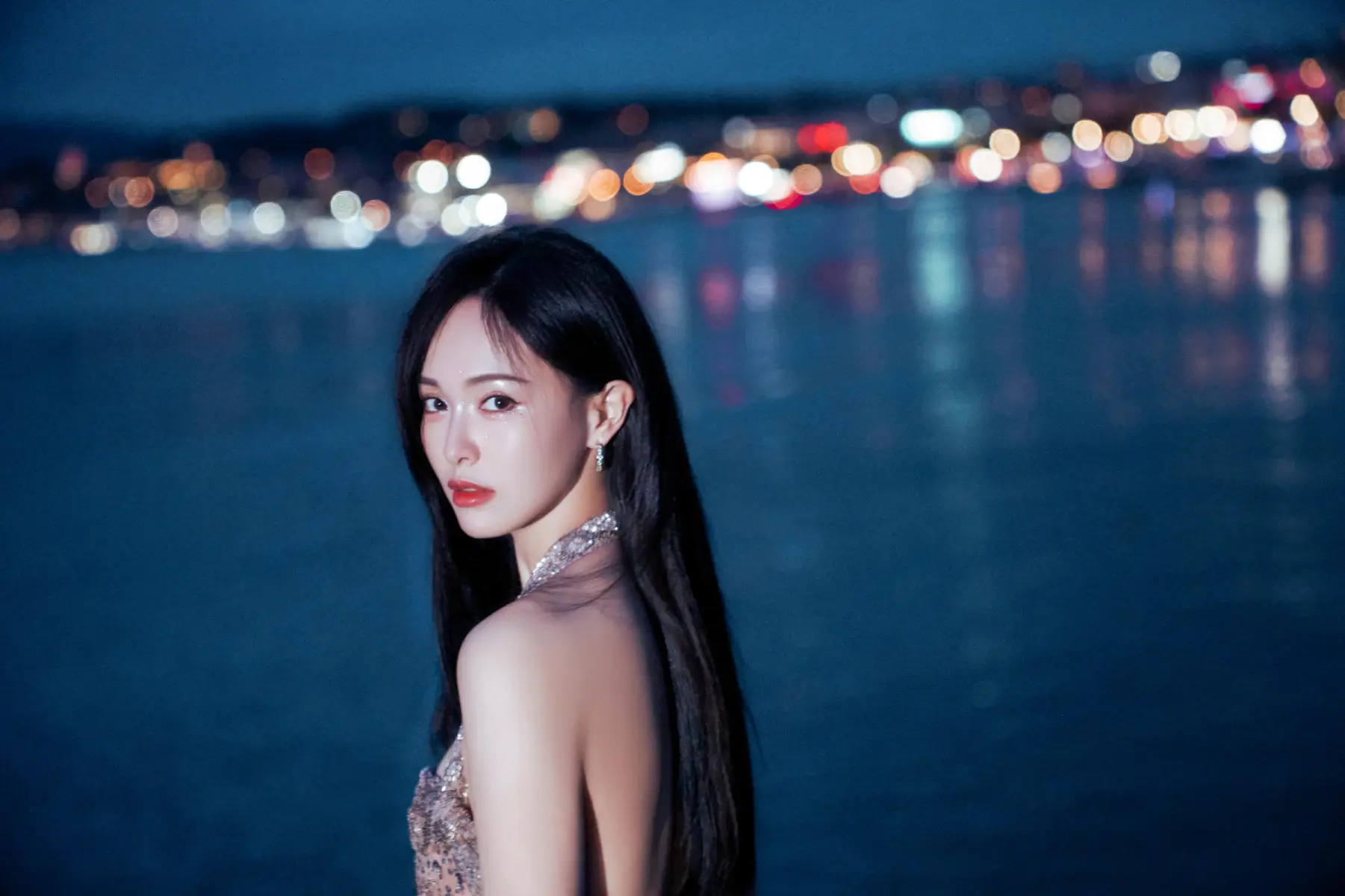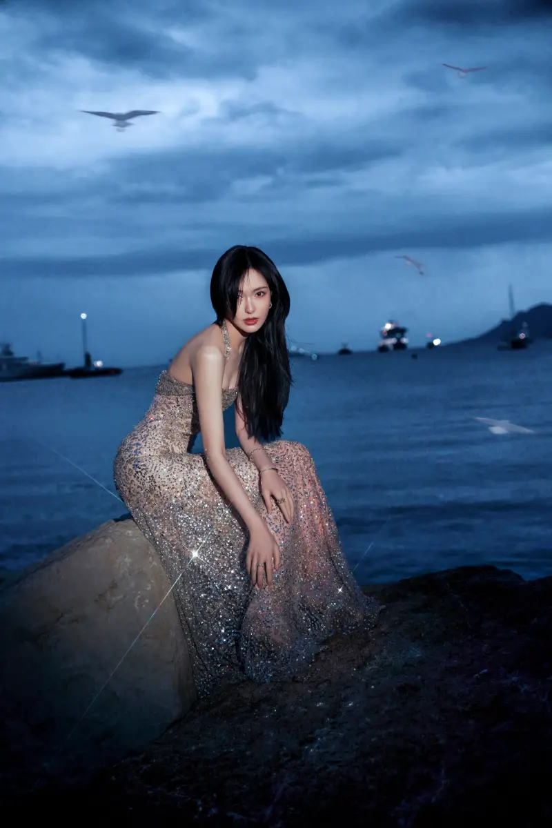 唐嫣穿亮片刺绣裙明艳照人 戛纳海边伫立满眼星河