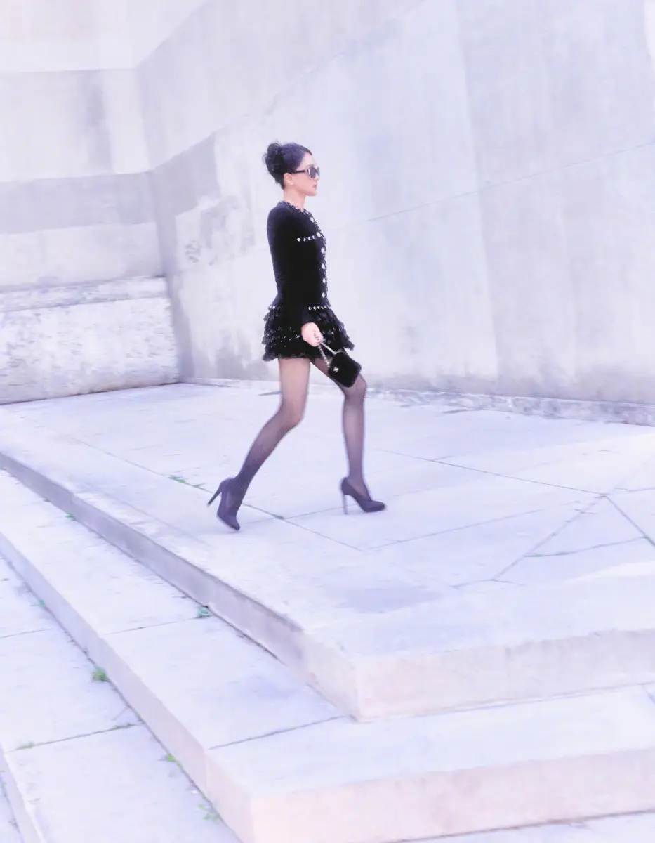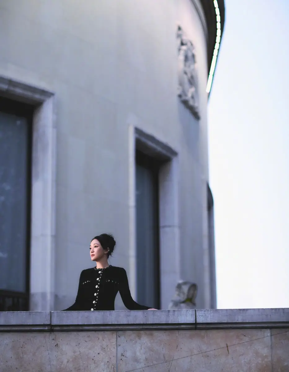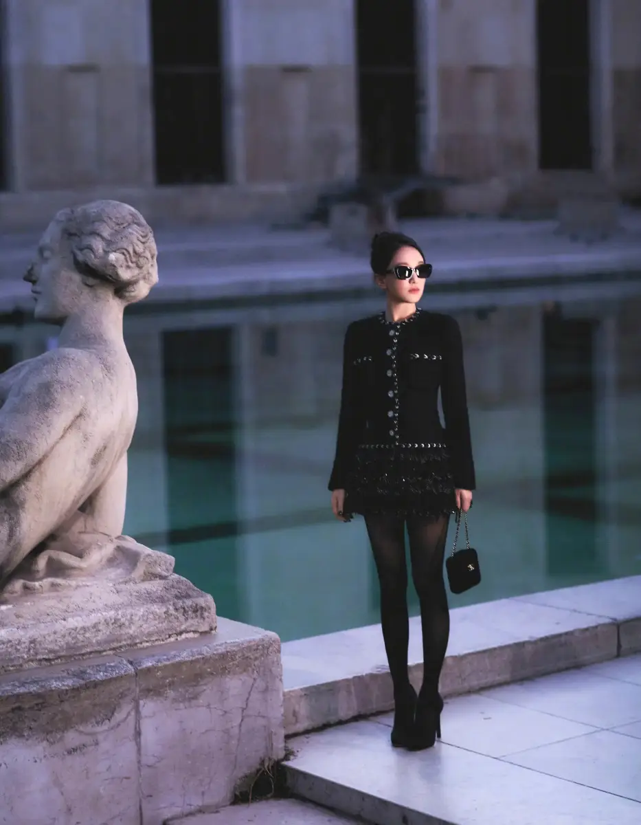 周迅巴黎看秀造型曝光 穿黑色小香风套装性感酷飒