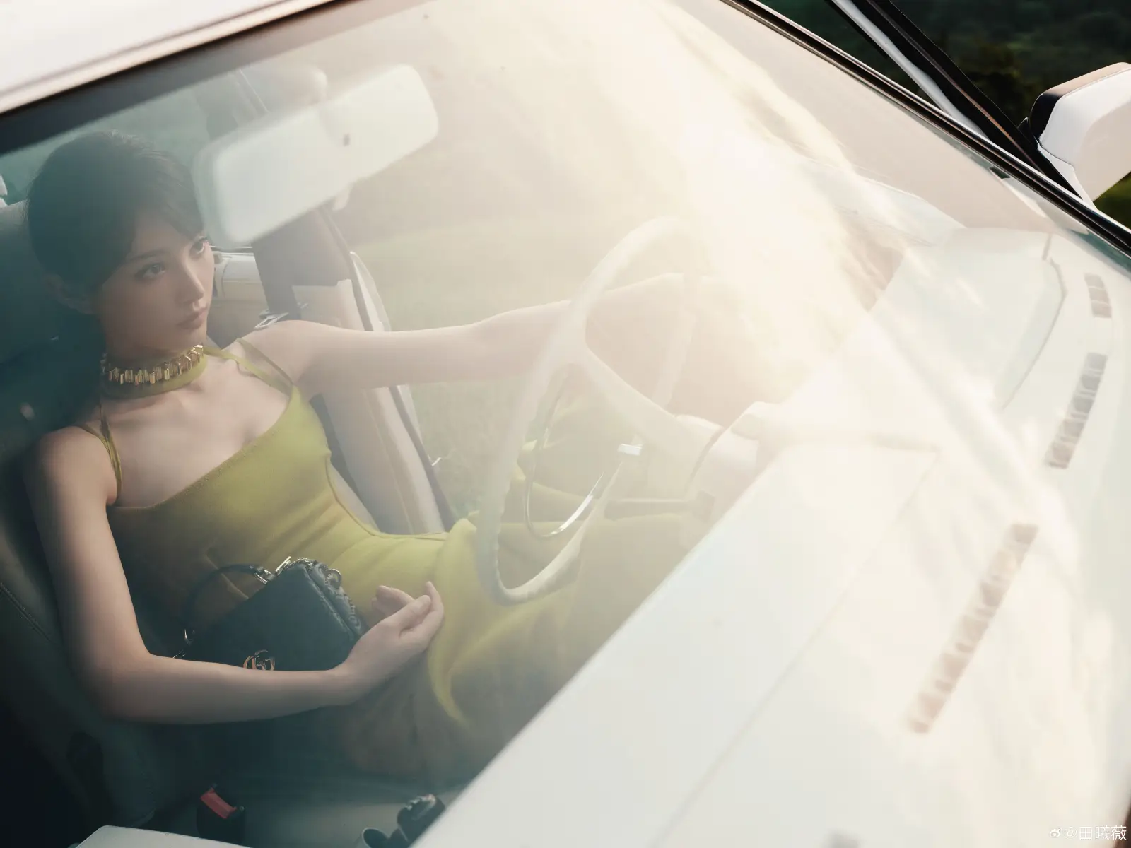 田曦薇坐在车上回眸望向镜头,宛如富家千金。