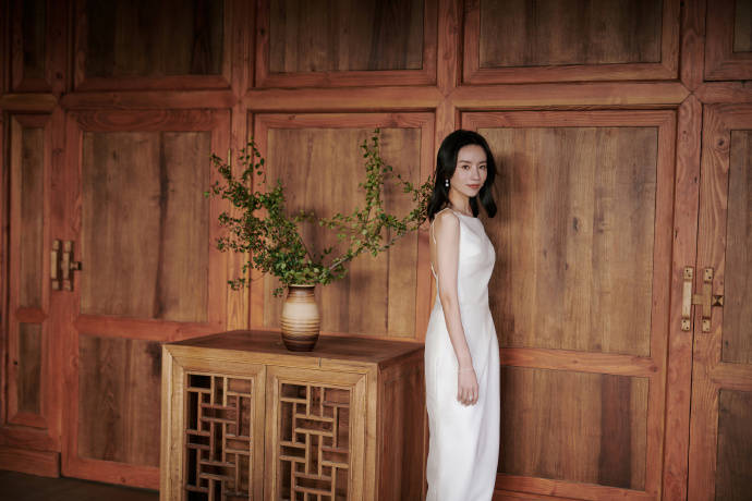 董洁一袭珍珠白裙优雅纯真 置身古风宅院身姿婉约