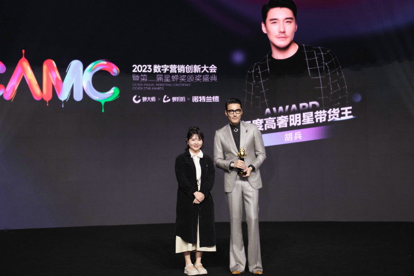 明星经纪公司资讯!近日,胡兵(胡兵经纪公司)在2023蝉妈妈数字营销创新大会荣获“年度高奢明星带货王”奖项,颁奖时,胡兵身着灰色西装,搭配黑框眼镜,以一贯精致的绅士形象出席大会。