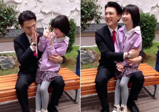 靳东和剧中女儿兴奋玩闹,环抱小女孩不撒手,画面温馨